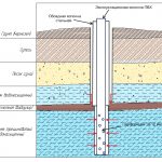 - труба с кондуктором – принципиальное устройство скважины будет таким же как и с одной обсадной трубой. Кондуктор играет роль защиты колонны от давления почвы. Обычно он используется когда при бурении попадаются большие плывуны, в этом случае, вначале устанавливается труба большого сечения. А затем, через нее проходит основная колонна.